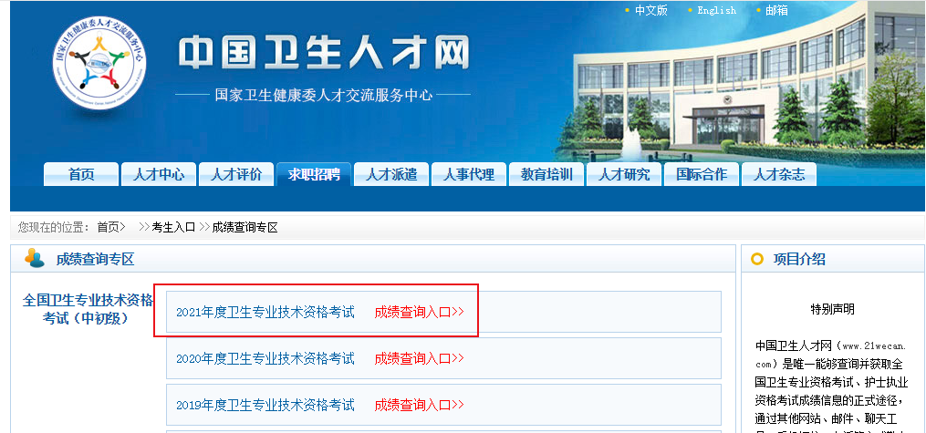 1、登錄“中國衛(wèi)生人才網(wǎng)”網(wǎng)站,點(diǎn)擊“進(jìn)入2021年度衛(wèi)生專業(yè)技術(shù)資格考試查分入口”。