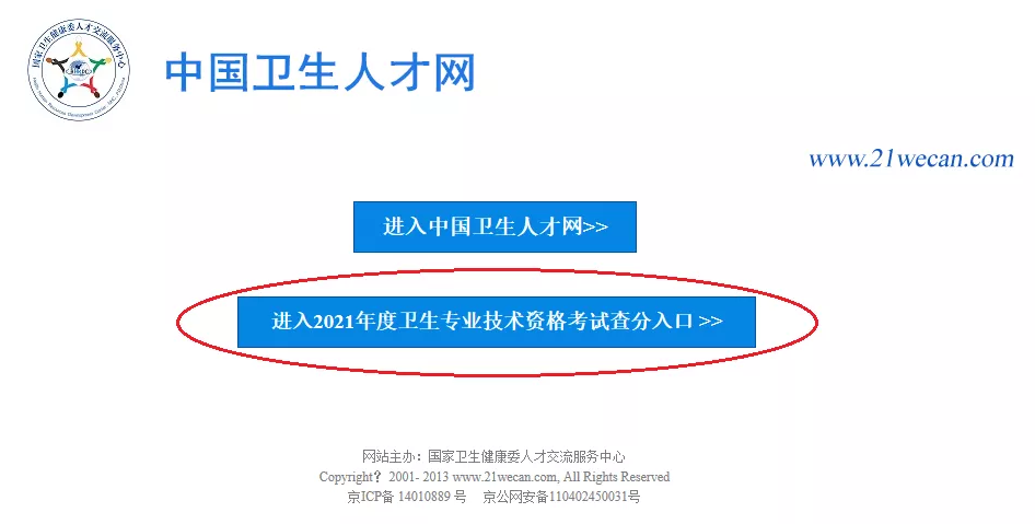 1、打開中國衛(wèi)生人才網(wǎng),點擊“進(jìn)入2021年度衛(wèi)生專業(yè)技術(shù)資格考試查分入口”鏈接。