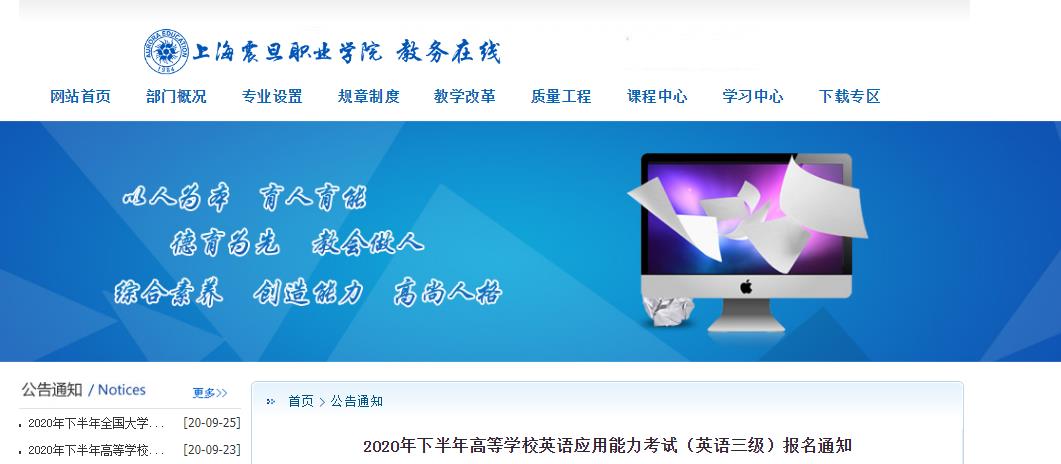 從上海震旦職業(yè)學(xué)院教務(wù)處獲悉,2020年下半年上海震旦職業(yè)學(xué)院英語應(yīng)用能力考試(英語三級)報名通知已公布,報名時間為9月27日,12月13日舉行考試,具體詳情如下: