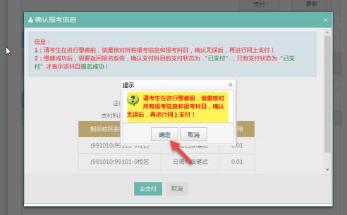 22、頁(yè)面提示確認(rèn)報(bào)考信息,點(diǎn)擊“去支付”,再次提示確認(rèn)報(bào)考信息,點(diǎn)擊“確定”