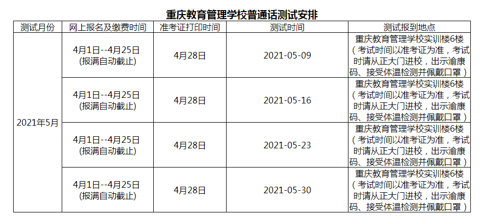 從重慶教育管理學(xué)校獲悉,重慶教育管理學(xué)校2021年5月普通話水平測試安排已公布,4月1日起報名,具體詳情如下: