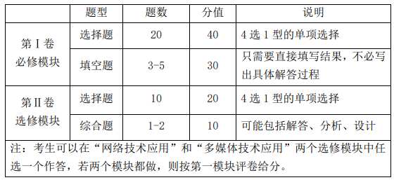 信息技術(shù)高考考試與通用技術(shù)合卷,采用閉卷、筆試形式,總考試時(shí)間為120分鐘,試卷滿分為200分,其中信息技術(shù)科目100分,必修部分占70%,選修部分占30%。