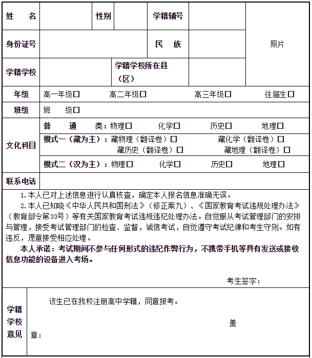 甘肅省冬季普通高中學(xué)業(yè)水平考試考生報(bào)名確認(rèn)表