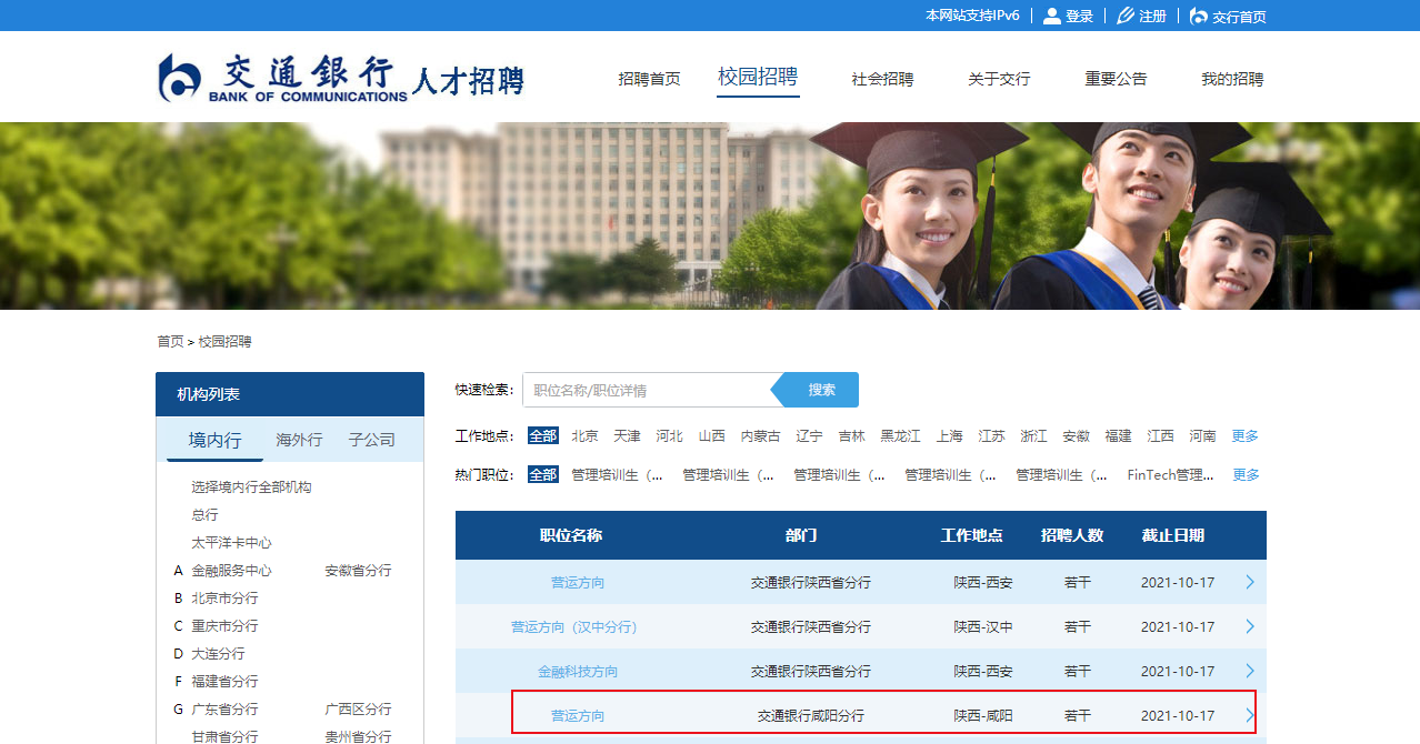 2022交通銀行陜西咸陽分行校園招聘信息已發(fā)布,報名時間:2021年10月17日截止,現(xiàn)將招聘詳情發(fā)布如下: