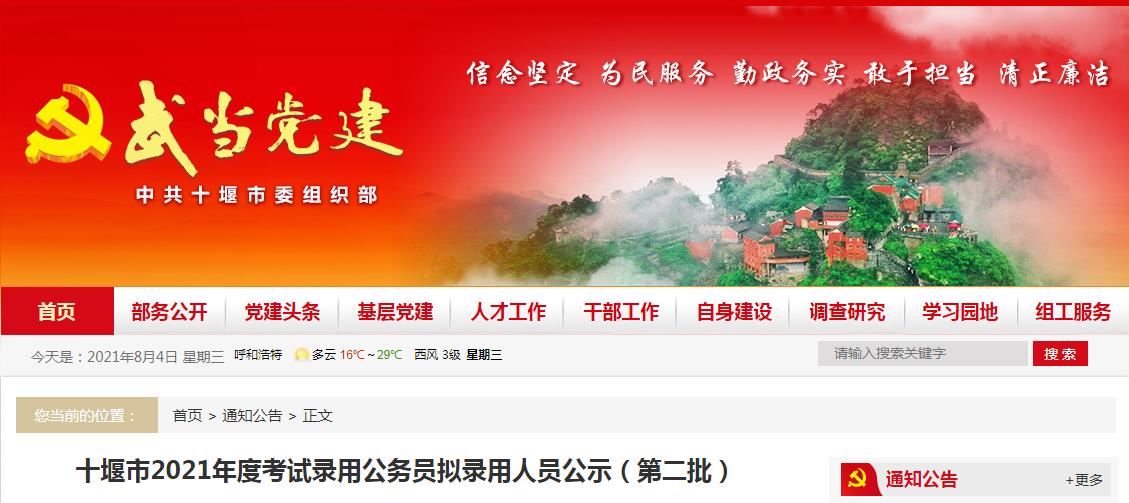 根據(jù)《湖北省2021年度省市縣鄉(xiāng)考試錄用公務員工作實施方案》,經筆試、面試、體檢和考察等環(huán)節(jié),現(xiàn)將十堰市2021年度考試錄用公務員部分職位擬錄用人員(第二批)予以公示,公示時間為5個工作日。(具體名單點擊查看)