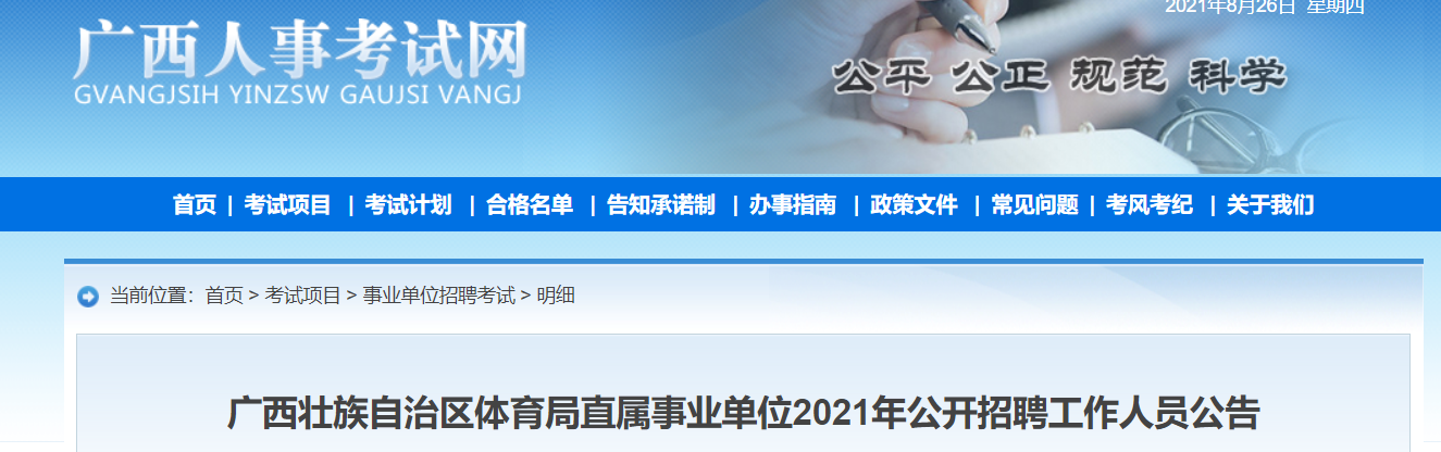 3.筆試時(shí)間。根據(jù)疫情防控情況,筆試時(shí)間待定。筆試前5個(gè)工作日,在廣西壯族自治區(qū)體育局網(wǎng)站(tyj.gxzf.gov.cn)發(fā)布筆試公告,公布開(kāi)考崗位、考試時(shí)間、地點(diǎn)和注意事項(xiàng)。