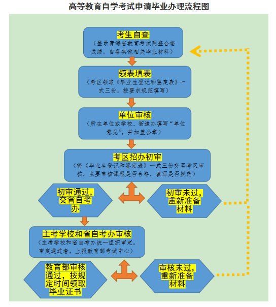 根據(jù)國(guó)務(wù)院《高等教育自學(xué)考試暫行條例》(國(guó)發(fā)〔1988〕15號(hào))、教育部《高等教育自學(xué)考試考籍管理工作規(guī)定》(教考試〔2006〕3號(hào))和青海省自考辦《青海省高等教育自學(xué)考試畢業(yè)證辦理辦法(修訂)》(青考委辦〔2012〕17號(hào))文件規(guī)定,結(jié)合我省實(shí)際,本著公開、規(guī)范、易操作原則,省自考辦制定如下申請(qǐng)畢業(yè)辦理流程,大化為考生提供便利。