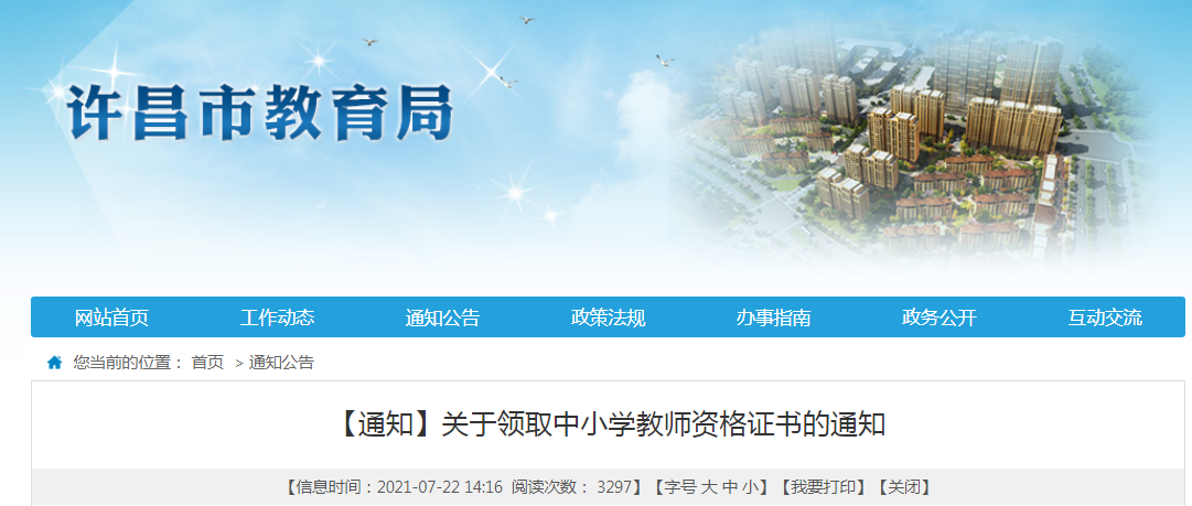 從許昌市教育局獲悉,2021河南許昌市中小學教師資格證書領取通知已公布,請相關人員仔細閱讀,具體詳情如下: