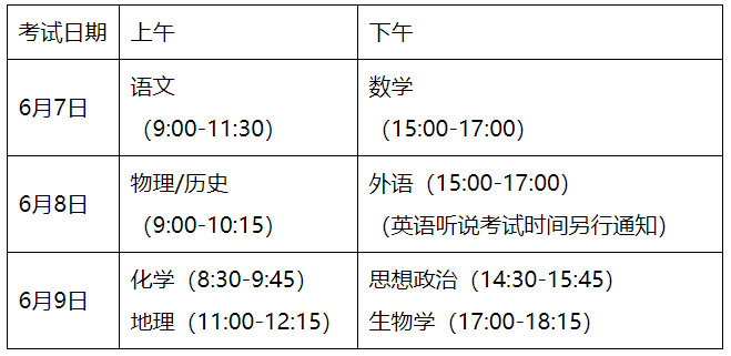 注:全國統(tǒng)一高考科目考試時間安排以教育部公布的為準,如有調(diào)整,我省選擇性考試科目的考試安排將做相應(yīng)調(diào)整。