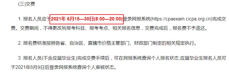 1.報名人員應(yīng)于2021年6月15—30日(8:00—20:00)登錄網(wǎng)報系統(tǒng)(https://cpaexam.cicpa.org.cn)完成交費。交費期間,不得更改所報考科目、報考考點、相關(guān)報名信息,交費完成后,報名費不予退還。