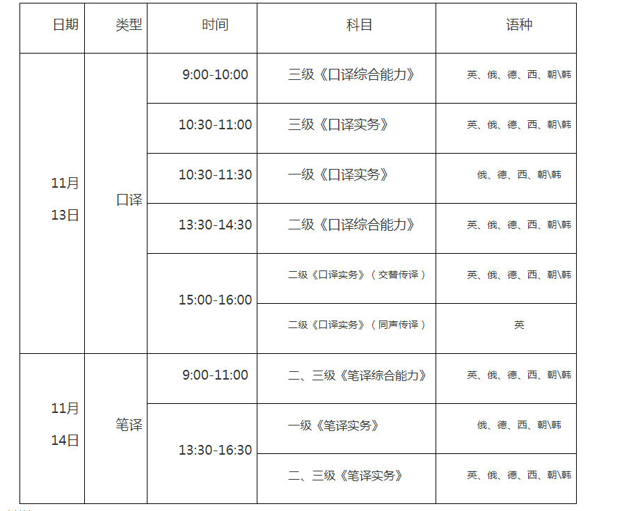 英語一級口譯、筆譯考試只在上半年舉行,英語二級口譯(同聲傳譯)只在下半年舉行考試,英語二級口譯(交替?zhèn)髯g)、英語二級筆譯、英語三級口譯、英語三級筆譯上下半年各舉行一次考試;法語、日語、阿語、葡語的一、二、三級口譯考試、筆譯考試均在上半年舉行;俄語、德語、西語、朝/韓語的一、二、三級口譯考試、筆譯考試均在下半年舉行。