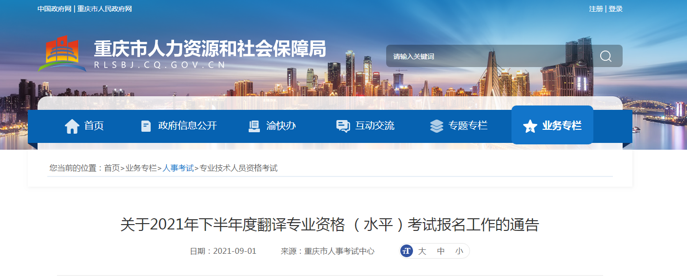 根據(jù)人力資源和社會保障部人事考試中心《關(guān)于2021年度翻譯專業(yè)資格(水平)考試考務(wù)工作的通知》(人考中心函〔2021〕7號)規(guī)定和重慶市人事考試中心《關(guān)于做好2021年度下半年度翻譯專業(yè)資格(水平)考試考務(wù)工作的通知》(渝人考〔2021〕51號)的要求,為方便廣大考生報考,現(xiàn)將有關(guān)事項通告如下: