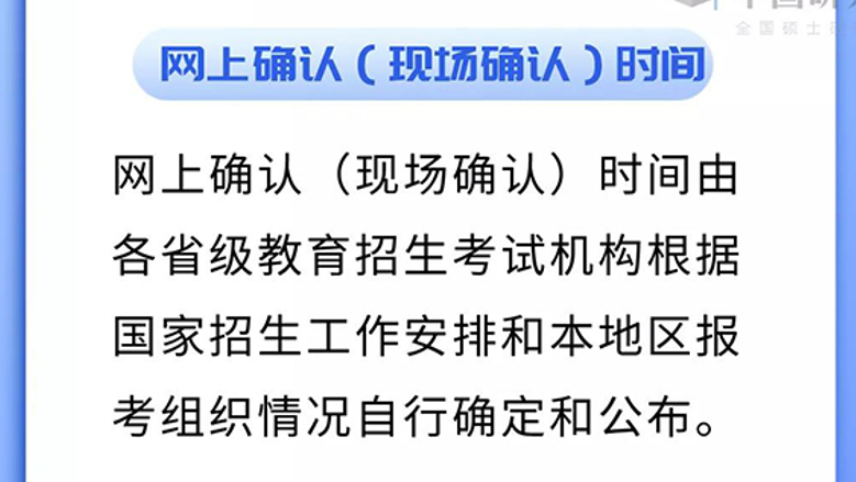 1.所有考生(不含推免生)均應(yīng)當在規(guī)定時間內(nèi)在網(wǎng)上或到報考點指定地點現(xiàn)場核對并確認其網(wǎng)上報名信息,逾期不再補辦。網(wǎng)上確認(現(xiàn)場確認)時間由各省級教育招生考試機構(gòu)根據(jù)國家招生工作安排和本地區(qū)報考組織情況自行確定和公布。
