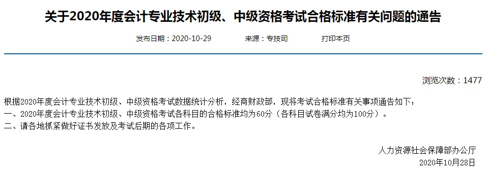 根據(jù)2020年度會計專業(yè)技術(shù)初級資格考試數(shù)據(jù)統(tǒng)計分析,經(jīng)商財政部,現(xiàn)將考試合格標(biāo)準(zhǔn)有關(guān)事項通告如下: