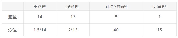 單選題14小題,每小題1.5分,共21分;多選題12小題,每小題2分,共24分;計(jì)算分析題5小題共40分,其中一道小題可以用中文或英文解答,如使用英文解答,須全部使用英文,答題正確的,增加5分,計(jì)算分析題得分為45分;綜合題1題15分。