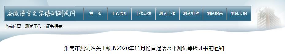 從安徽語言文字培訓(xùn)測試網(wǎng)獲悉,2020年11月安徽淮南市普通話水平測試等級證書領(lǐng)取通知已公布,2021年1月11日-12日領(lǐng)取證書,具體詳情如下: