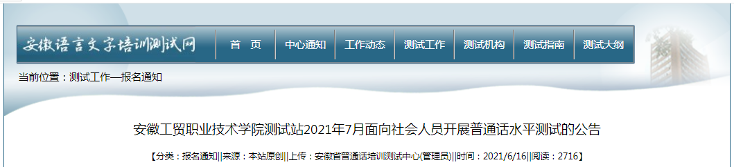 從安徽語(yǔ)言文字培訓(xùn)測(cè)試網(wǎng)獲悉,2021年7月安徽工貿(mào)職業(yè)技術(shù)學(xué)院面向社會(huì)人員開展普通話水平測(cè)試的公告已公布,報(bào)名時(shí)間為6月18日起,考試時(shí)間為7月10日-7月11日,準(zhǔn)考證打印時(shí)間為考前三天,成績(jī)查詢時(shí)間為考后一個(gè)月,具體詳情如下:
