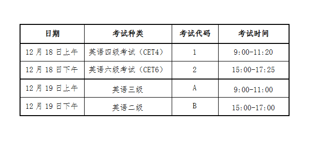 2021年下半年全國大學英語四、六級考試筆試(簡稱CET4-6)和口試(簡稱CET-SET)將分別于12月18日和11月20-21日舉行,高等學校英語應用能力考試(簡稱A-B)將于12月19日舉行(具體時間安排見附件1)?,F(xiàn)就報名的有關事項公告如下: