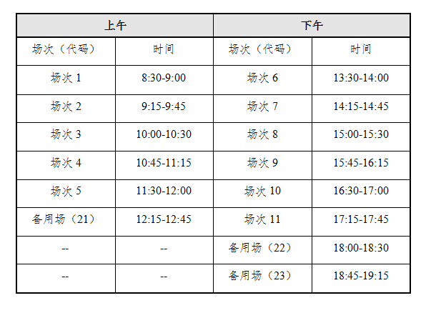英語四級口語考試(CET-SET4)考試時間為11月20日(F213次),英語六級口語考試(CET-SET6)考試時間為11月21日(S214次),具體場次安排如下: