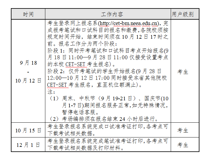 (二)時間安排。根據(jù)教育部考試中心的要求和我省實際情況,網上報名時間定于9月18日至10月12日進行,具體時間安排如下: