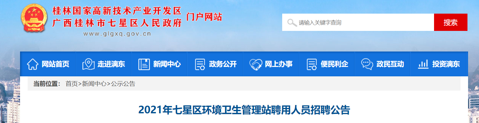 公開招聘期間有關(guān)信息發(fā)布,在桂林市七星區(qū)人民政府網(wǎng)(http://zwgk.glgxq.gov.cn/),供報考人員登錄查詢。