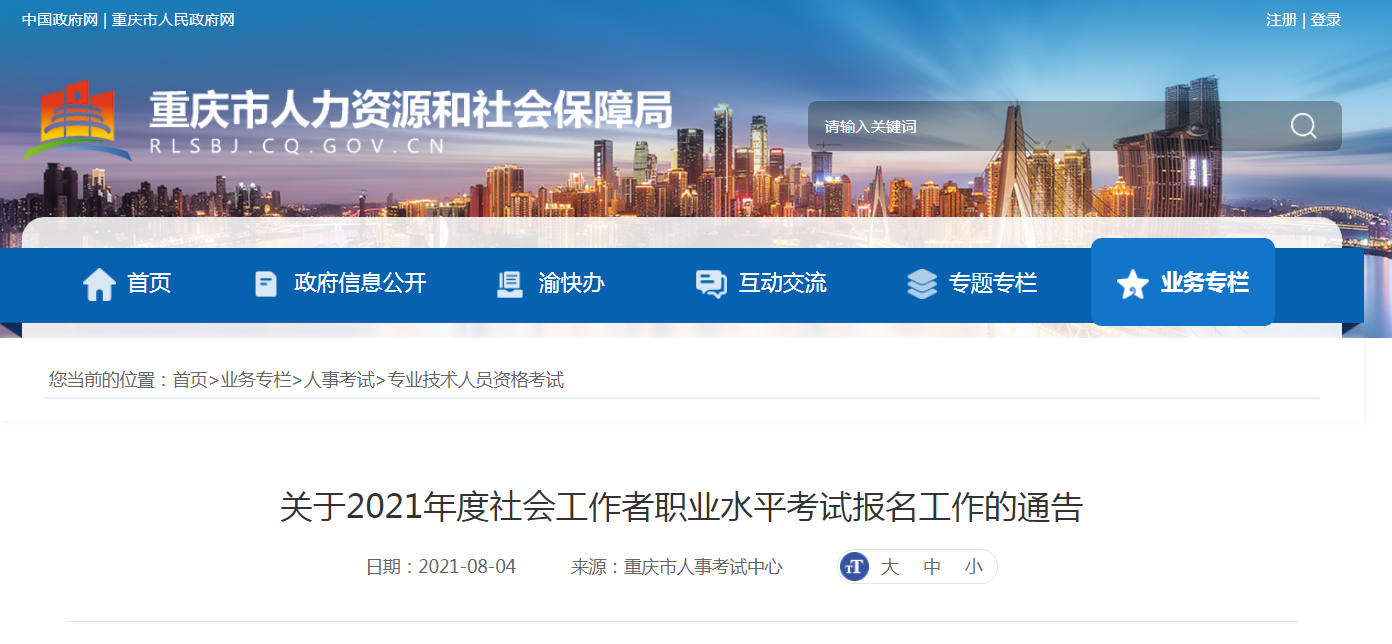 從重慶人力資源和社會(huì)保障局發(fā)布的《2021年重慶社會(huì)工作者職業(yè)水平考試報(bào)名工作的通告》得知,2021年重慶社會(huì)工作者職業(yè)水平考試報(bào)名時(shí)間、條件及入口已公布,報(bào)名時(shí)間為8月10日-8月16日,具體詳情如下: