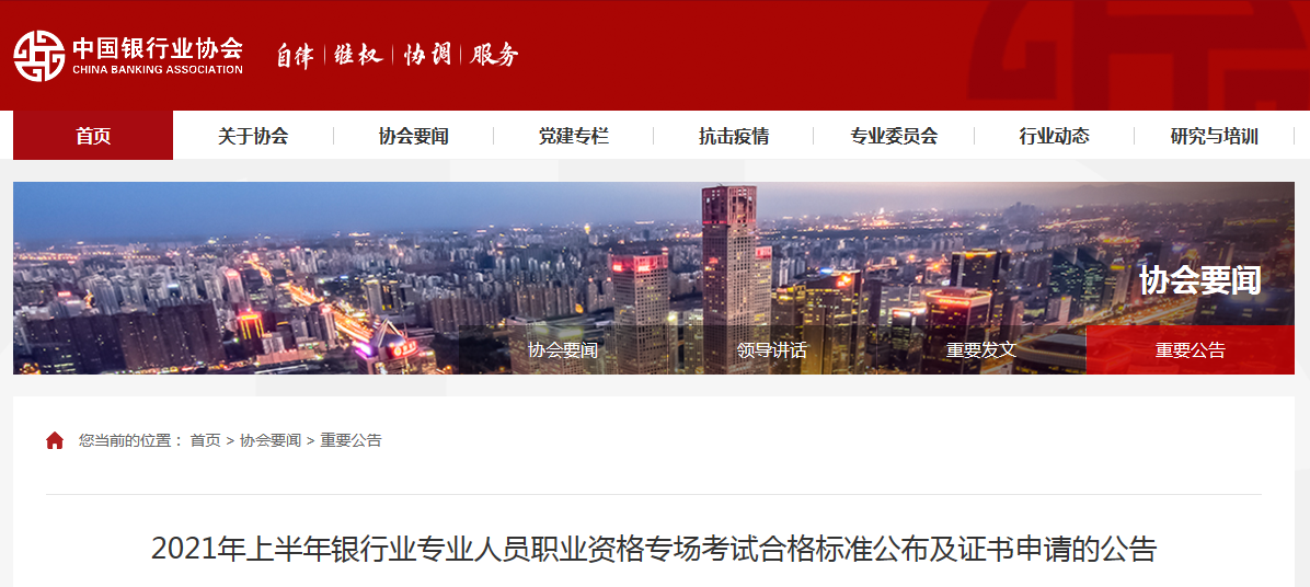 中國銀行業(yè)協(xié)會發(fā)布”2021年上半年銀行業(yè)專業(yè)人員職業(yè)資格專場考試合格標(biāo)準(zhǔn)公布及證書申請的公告“,2021上半年新疆中級銀行從業(yè)資格專場考試證書申請時間為8月9日9:00至8月15日17:00,在證書申請期間,符合證書申請條件的考生須登錄考試服務(wù)平臺,按流程在線提交證書申請,詳細(xì)內(nèi)容如下: