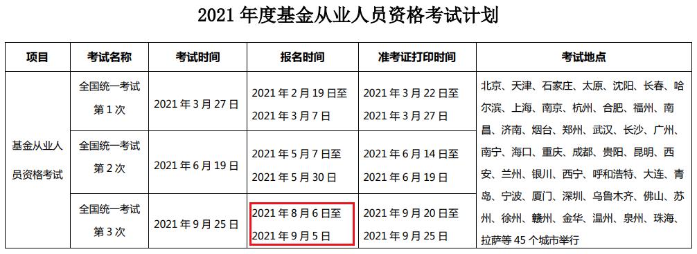 根據(jù)“中國證券投資基金業(yè)協(xié)會關(guān)于發(fā)布2021年度考試計劃的通知”得知,2021年廣西第三次基金從業(yè)資格報名時間為2021年8月6日至9月5日,考生可在規(guī)定的報名時間內(nèi)通過中國證券投資基金業(yè)協(xié)會(http://www.amac.org.cn)提供的報名鏈接進(jìn)行報名,也可直接登錄報名網(wǎng)站(http://baoming.amac.org.cn:10080)按照要求報名。