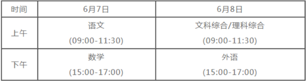 6月8日:9:00至11:30 考文科綜合/理科綜合科目;15:00至17:00 考外語(yǔ)科目,有外語(yǔ)聽力測(cè)試內(nèi)容的應(yīng)安排在外語(yǔ)筆試考試開始前進(jìn)行。