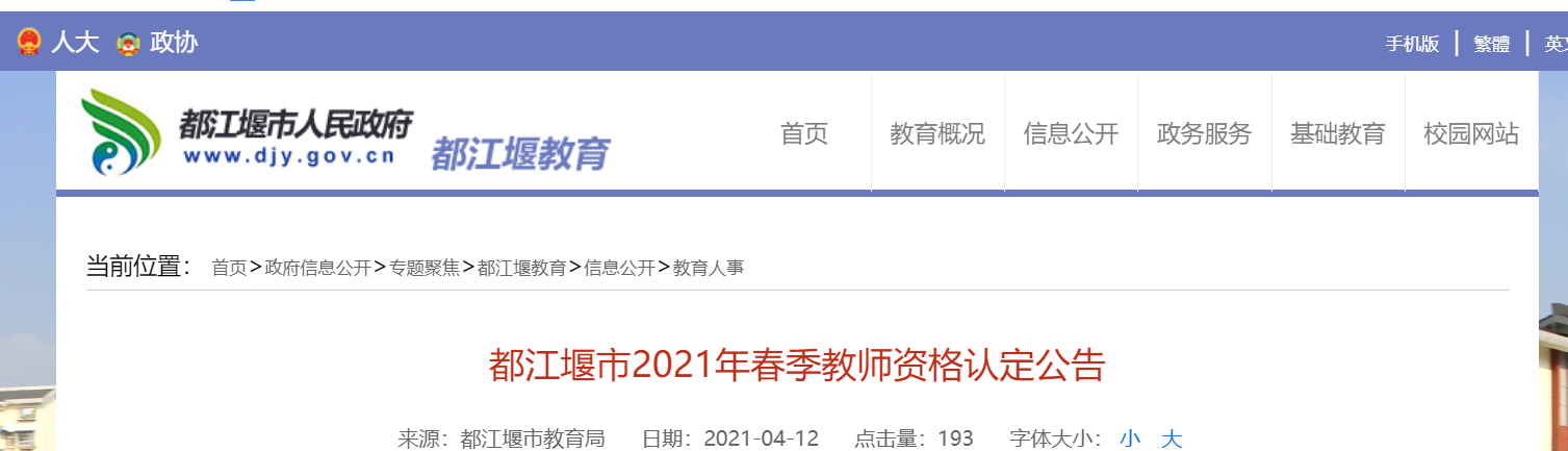 從都江堰市人民政府獲悉,2021年春季四川都江堰教師資格認(rèn)定公告已公布,請(qǐng)相關(guān)人員仔細(xì)閱讀,具體詳情如下:
