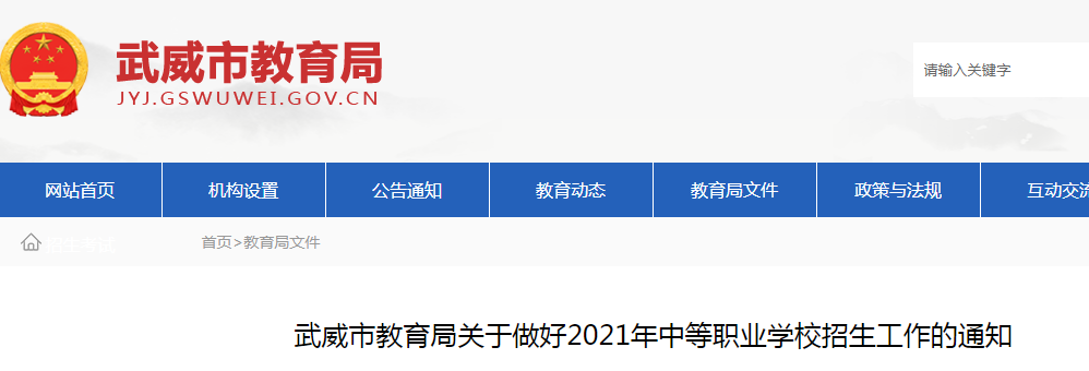 從武威市教育局了解到,2021年甘肅武威中等職業(yè)學(xué)校招生工作的通知已經(jīng)發(fā)布,為方便考生了解情況,現(xiàn)將有關(guān)事宜通知如下: