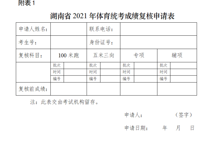 附表:1.湖南省2021年體育統(tǒng)考成績復(fù)核申請表(點擊下載)