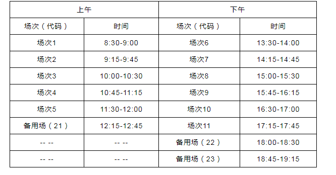 CET-SET4(英語(yǔ)四級(jí)口語(yǔ)考試)考試時(shí)間為5月22日,CET-SET6(英語(yǔ)六級(jí)口語(yǔ)考試)考試時(shí)間為5月23日。具體場(chǎng)次安排如下: