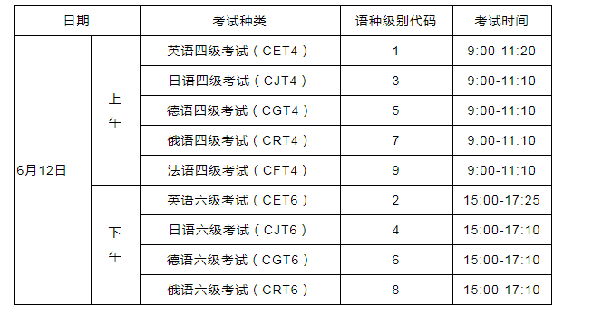 2021年上半年全國(guó)大學(xué)英語(yǔ)四、六級(jí)考試筆試(以下簡(jiǎn)稱(chēng)CET)和口試(以下簡(jiǎn)稱(chēng)CET-SET)將分別于6月12日和5月22至23日舉行,其中筆試于6月12日上午開(kāi)考四級(jí)(英語(yǔ)、日語(yǔ)、德語(yǔ)、俄語(yǔ)和法語(yǔ)),下午開(kāi)考六級(jí)(英語(yǔ)、日語(yǔ)、德語(yǔ)和俄語(yǔ));口試于5月22日開(kāi)考英語(yǔ)四級(jí),5月23日開(kāi)考英語(yǔ)六級(jí)。現(xiàn)將我省報(bào)名有關(guān)事項(xiàng)通知如下:
