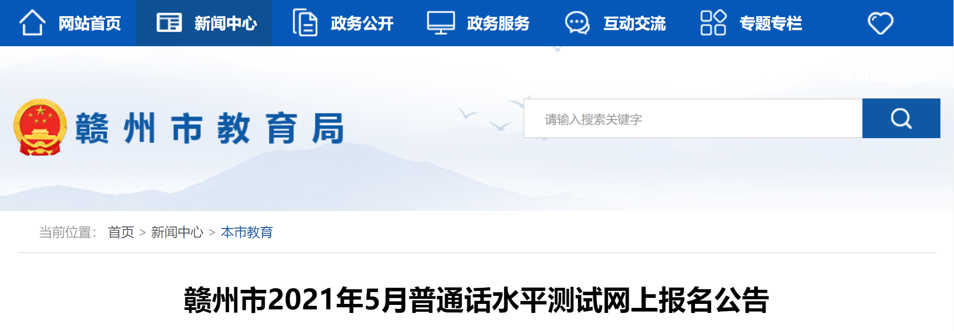 從贛州市教育局發(fā)布的《2021年5月江西贛州普通話水平測試公告》得知,2021年5月江西贛州普通話水平考試時間已公布,報名時間為4月28日-4月29日,考試時間為5月7日起,準考證打印時間為5月1日后,具體詳情如下: