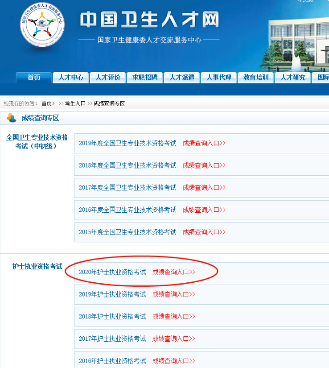 1、登錄“中國衛(wèi)生人才網(wǎng)”網(wǎng)站,點擊進(jìn)入“2020年護(hù)士執(zhí)業(yè)資格考試成績查詢?nèi)肟凇薄?BR>