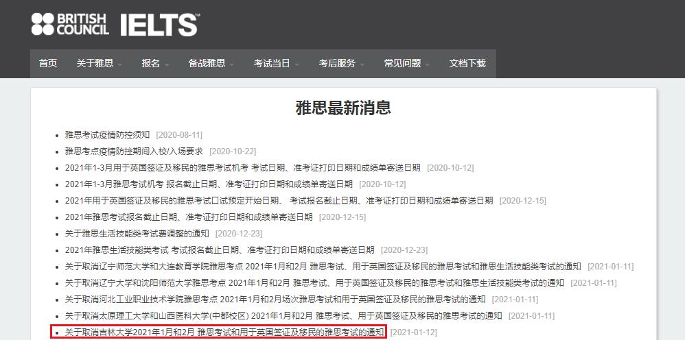 接英國(guó)文化教育協(xié)會(huì)通知,吉林大學(xué)雅思考點(diǎn)2021年1月和2月以下場(chǎng)次的雅思考試和用于英國(guó)簽證及移民的雅思考試因故取消。