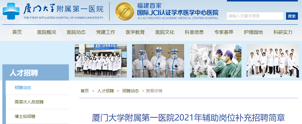 2021年福建廈門(mén)大學(xué)附屬第一醫(yī)院輔助崗位補(bǔ)充招聘公告【4人】已發(fā)布,報(bào)名時(shí)間為:2021年7月7日-7月13日?,F(xiàn)將招聘公告原文發(fā)布如下: