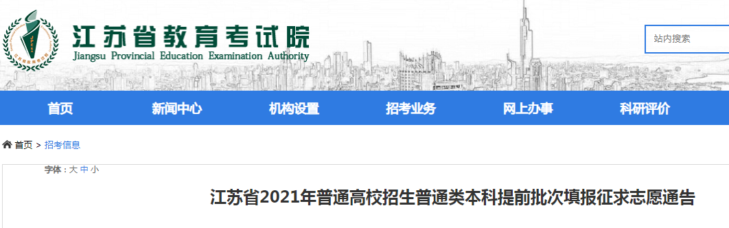 從江蘇省教育考試院了解到,江蘇省2021年普通高校招生普通類本科提前批次填報(bào)征求志愿通告已發(fā)布,現(xiàn)將有關(guān)事宜通知如下: