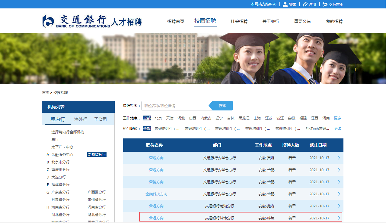 2022交通銀行安徽蚌埠分行校園招聘信息已發(fā)布,報(bào)名時(shí)間:2021年10月17日截止,現(xiàn)將招聘詳情發(fā)布如下: