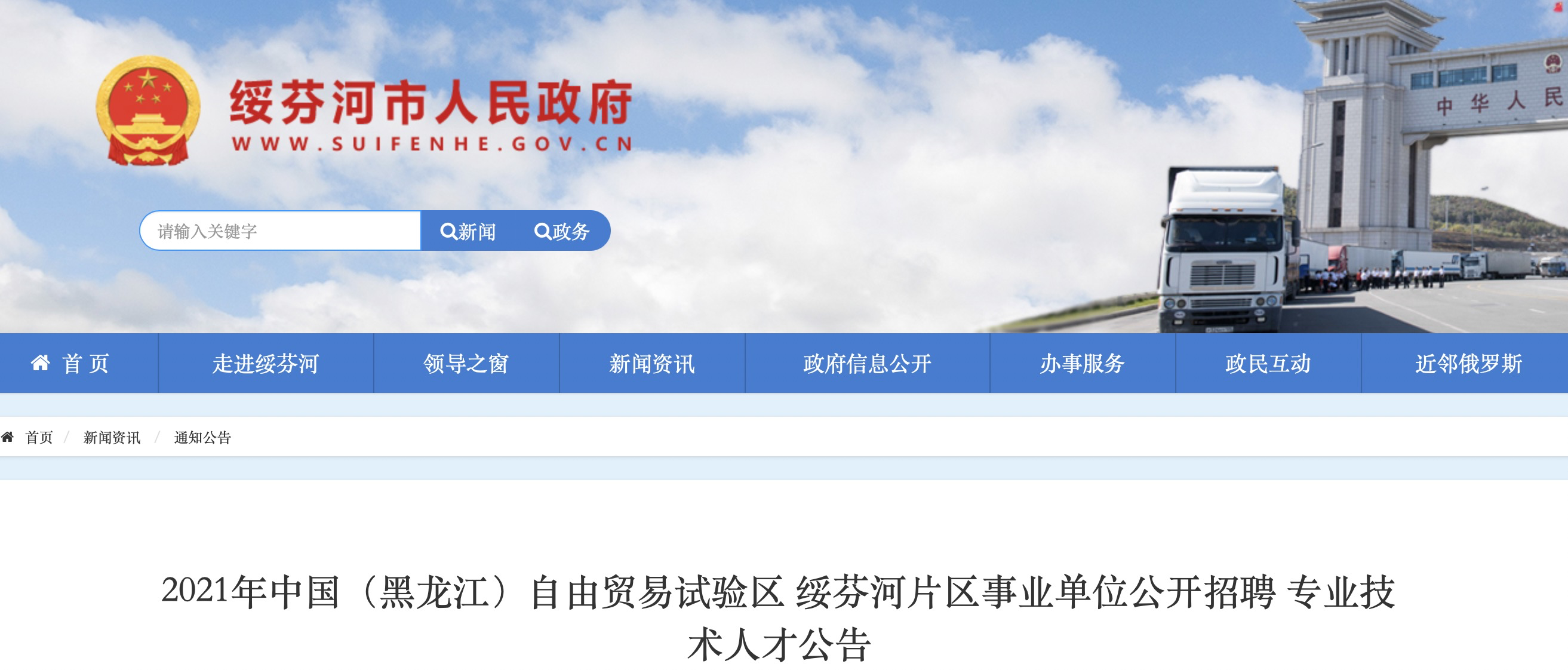 2021年中國(黑龍江)自由貿(mào)易試驗(yàn)區(qū)綏芬河片區(qū)事業(yè)單位招聘公告已發(fā)布,網(wǎng)絡(luò)報(bào)名時(shí)間為:2021年8月28日09:00—9月1日17:00,現(xiàn)將招聘公告原文發(fā)布如下: