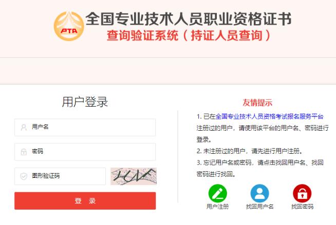 全國專業(yè)技術(shù)人員職業(yè)資格證書查詢驗證系統(tǒng)與全國專業(yè)技術(shù)人員資格考試報名服務(wù)平臺共享注冊信息,已在全國專業(yè)技術(shù)人員資格考試報名服務(wù)平臺注冊過的用戶,請使用該平臺的用戶名、密碼登錄證書查詢驗證系統(tǒng)。