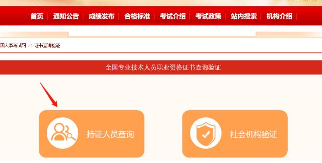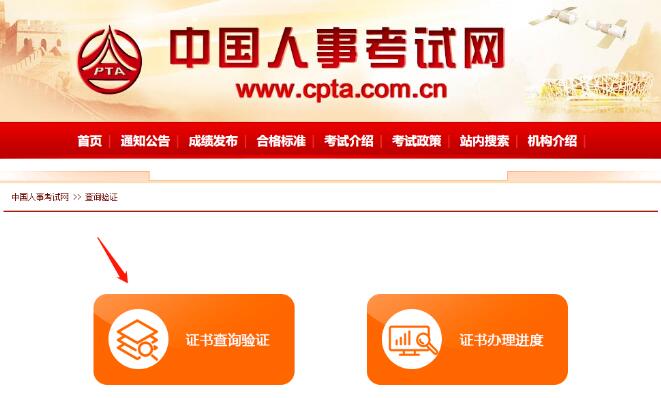 在中國人事考試網(wǎng)(http://www.cpta.com.cn/)資格證書模塊,選擇“證書查詢驗證”。