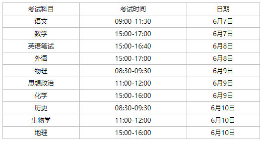 6月10日:8:30至9:30歷史;11:00至12:00生物學(xué);15:00至16:00地理。