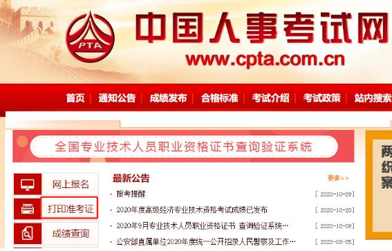 1、進入“中國人事考試網(wǎng)”,左側(cè)找到【打印準考證】,并點擊進入。如圖示(點擊圖片可進入中國人事考試網(wǎng)):