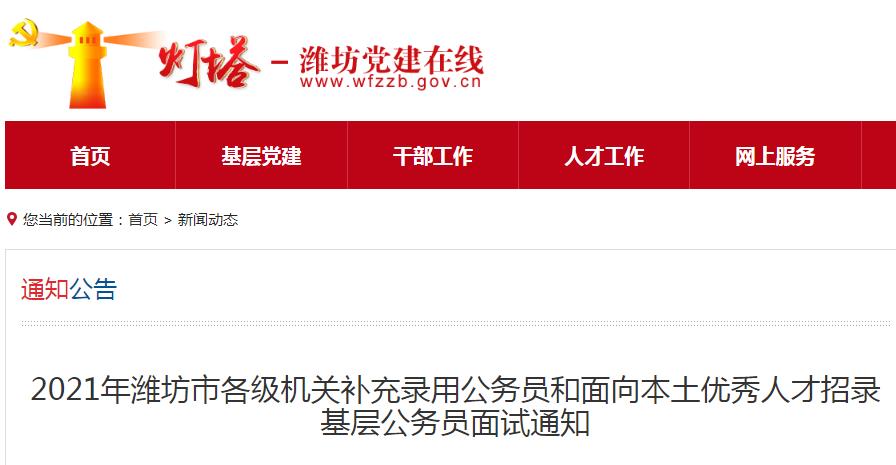 根據(jù)《2021年濰坊市各級(jí)機(jī)關(guān)補(bǔ)充錄用公務(wù)員公告》《2021年濰坊市面向本土優(yōu)秀人才招錄基層公務(wù)員公告》規(guī)定,結(jié)合工作實(shí)際,我市各級(jí)機(jī)關(guān)補(bǔ)充錄用公務(wù)員、面向本土優(yōu)秀人才招錄基層公務(wù)員面試工作將于5月30日統(tǒng)一在濰坊進(jìn)行。現(xiàn)將有關(guān)事宜通知如下: