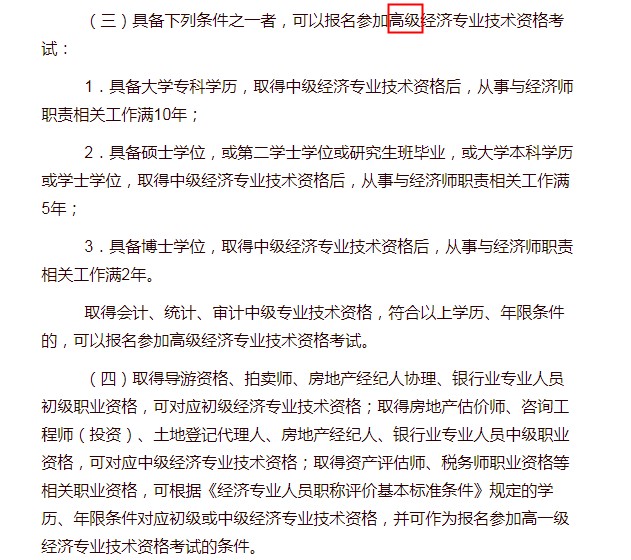 (二)具備下列條件之一者,可以報(bào)名參加高級(jí)經(jīng)濟(jì)專業(yè)技術(shù)資格考試:
