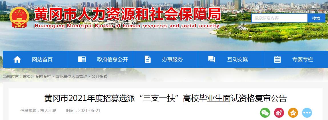 根據(jù)《湖北省2021年度招募選派“三支一扶”高校畢業(yè)生公告》(以下簡(jiǎn)稱《公告》)和省“三支一扶”辦《關(guān)于做好2021年度招募選派“三支一扶”高校畢業(yè)生面試工作的通知》(鄂三支一扶辦〔2021〕4號(hào))文件的相關(guān)規(guī)定,現(xiàn)將黃岡市2021年度招募選派“三支一扶”高校畢業(yè)生面試資格復(fù)審有關(guān)事宜公告如下: