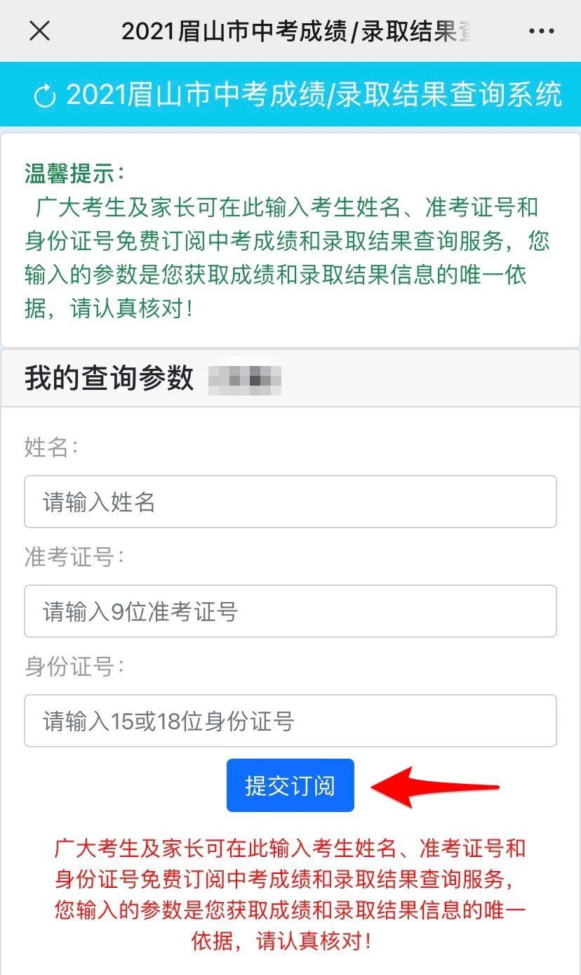 3輸入考生姓名、準(zhǔn)考證號(hào)、身份證號(hào),點(diǎn)擊提交訂閱。系統(tǒng)將免費(fèi)向訂閱者第一時(shí)間推送2021年個(gè)人各學(xué)科考試成績(jī)等級(jí)和普通高中錄取結(jié)果。(注:成績(jī)公布后不可再修改查詢參數(shù)信息)