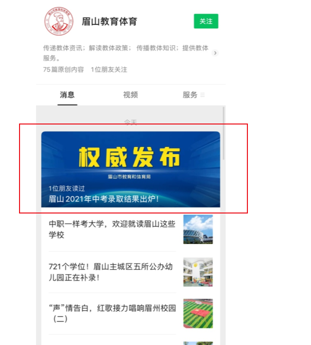 第一步 關(guān)注眉山市教育和體育局 官方微信公眾號(hào)“眉山教育體育”